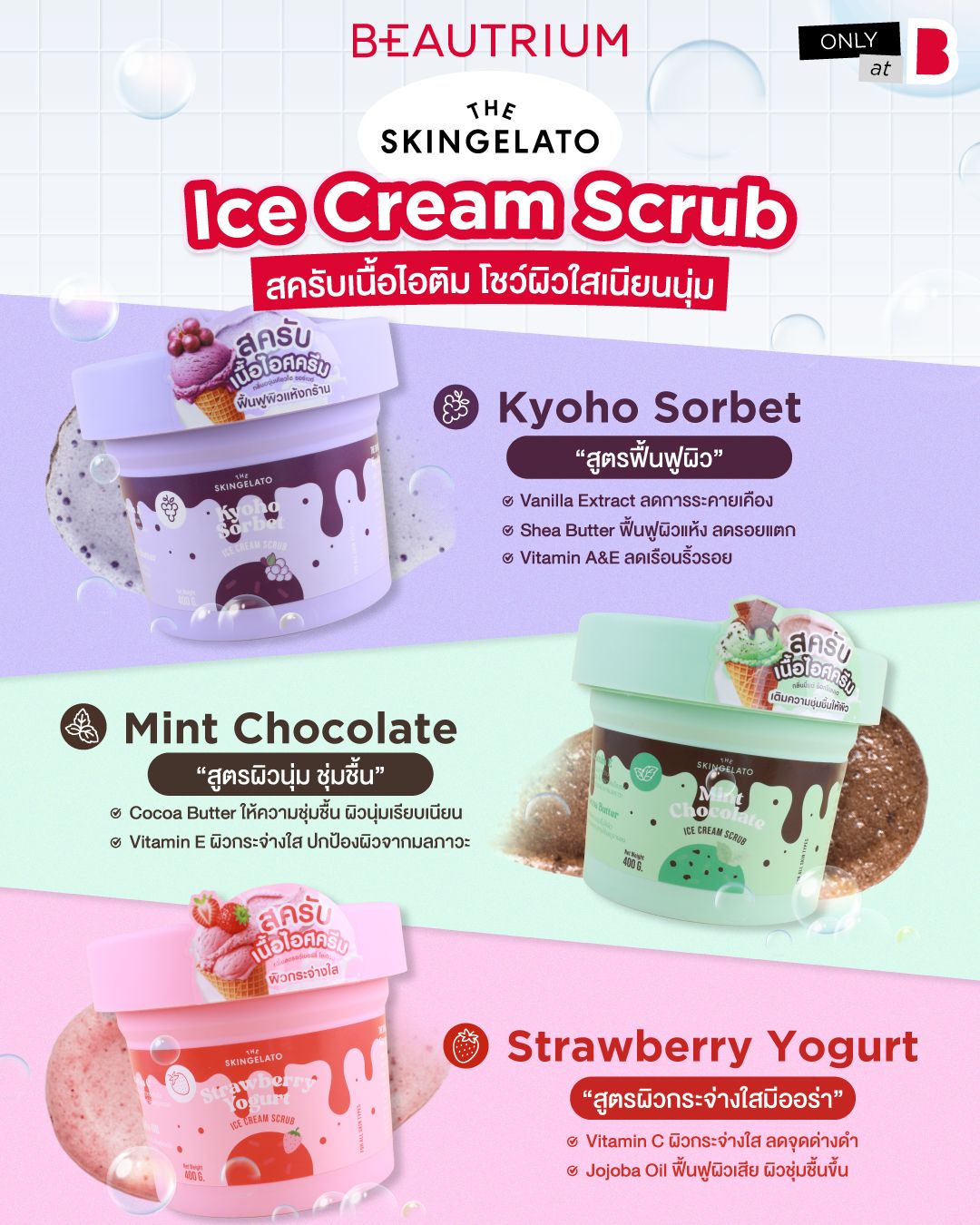 บอดี้สครับที่มาพร้อมเนื้อสัมผัสนุ่มละมุนราวกับไอศกรีม มอบความรู้สึกอ่อนโยนและสบายผิวขณะใช้