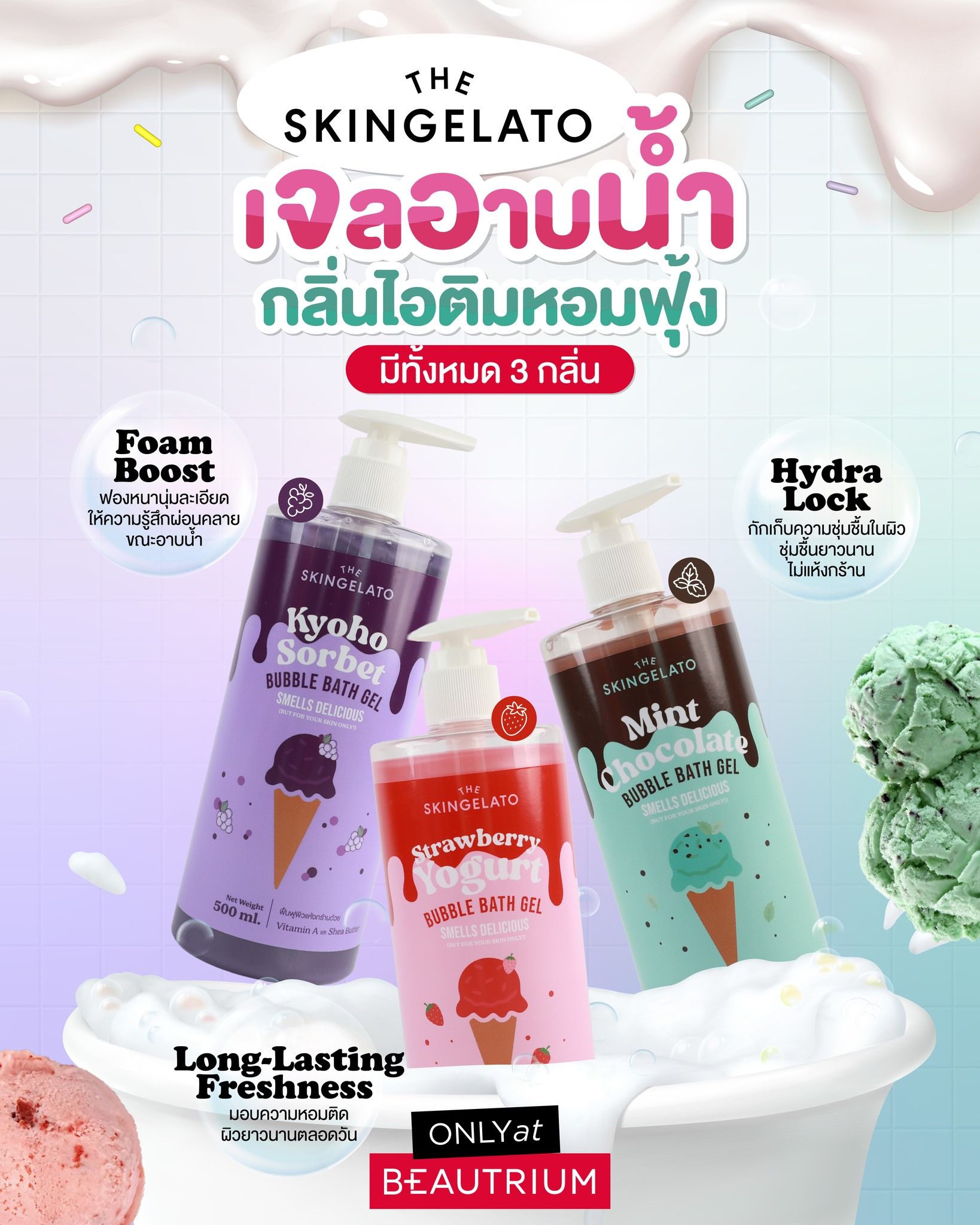 ใครยังไม่ลอง รีบไปจับจอง THE SKINGELATO Ice Cream Parlor Series ได้เลยที่ BEAUTRIUM ทุกสาขาและช่องทางออนไลน์